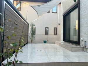 そして、リビングからお庭へはタイル貼りテラスで繋がります。タイルは600□と少し大きめなタイルを選んでいます✨