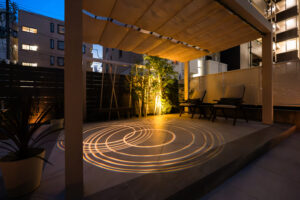 デザインライトの明かりがタイル貼りテラスに映し出され幻想的な空間✨