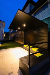 漆黒の美しさが光るテラス屋根と造作のベンチにダウンライトの組み合わせ✨
